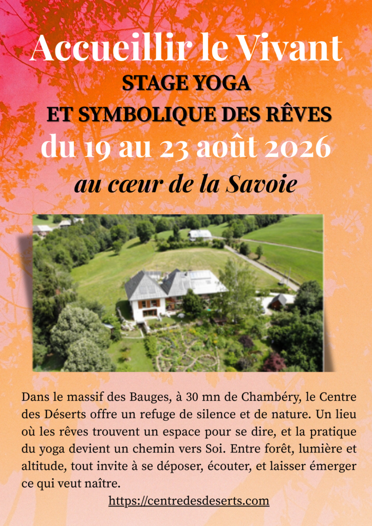 Nous proposons un stage où se rencontrent le Yoga inspiré des Yoga-Sutra, transmis dans l’esprit vivant de Peter Hersnack, et l’analyse des rêves selon C.G. Jung, telle qu’enseignée par Pierre Trigano et Agnès Vicent. Deux approches simples et complémentaires : écouter le message du Soi à travers les rêves et pratiquer un Yoga qui recentre, apaise et ouvre à la Présence. Maryse, psychanalyste symbolique, guide le groupe à accueillir et comprendre la sagesse des rêves. Bernard,enseignant de Yoga, transmet une pratique qui rétablit l’équilibre de l’énergie entre le corps, le souffle et la pensée. Ensemble ces deux voies invitent à dépasser la dualité intérieure et ouvrent un chemin d’évolution, d’unité et de paix.