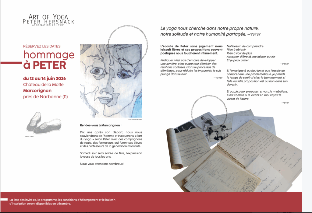 Nombreux sont les adhérents de Yosoli ayant connu Peter Hersnack et suivi son enseignement. Ce n’est pas mon cas et je le regrette, mais, pour approfondir la formation d’enseignant que j’ai suivie avec François Lorin, je découvre depuis plusieurs années son approche précieuse et originale du Yoga au travers des stages organisés par Colette Hersnack et Sylvie Palot.