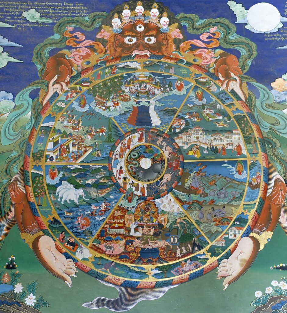 La Roue de la Vie, ou roue de l’existence karmique (bhavacakra) offre une synthèse visuelle saisissante de la doctrine bouddhique.